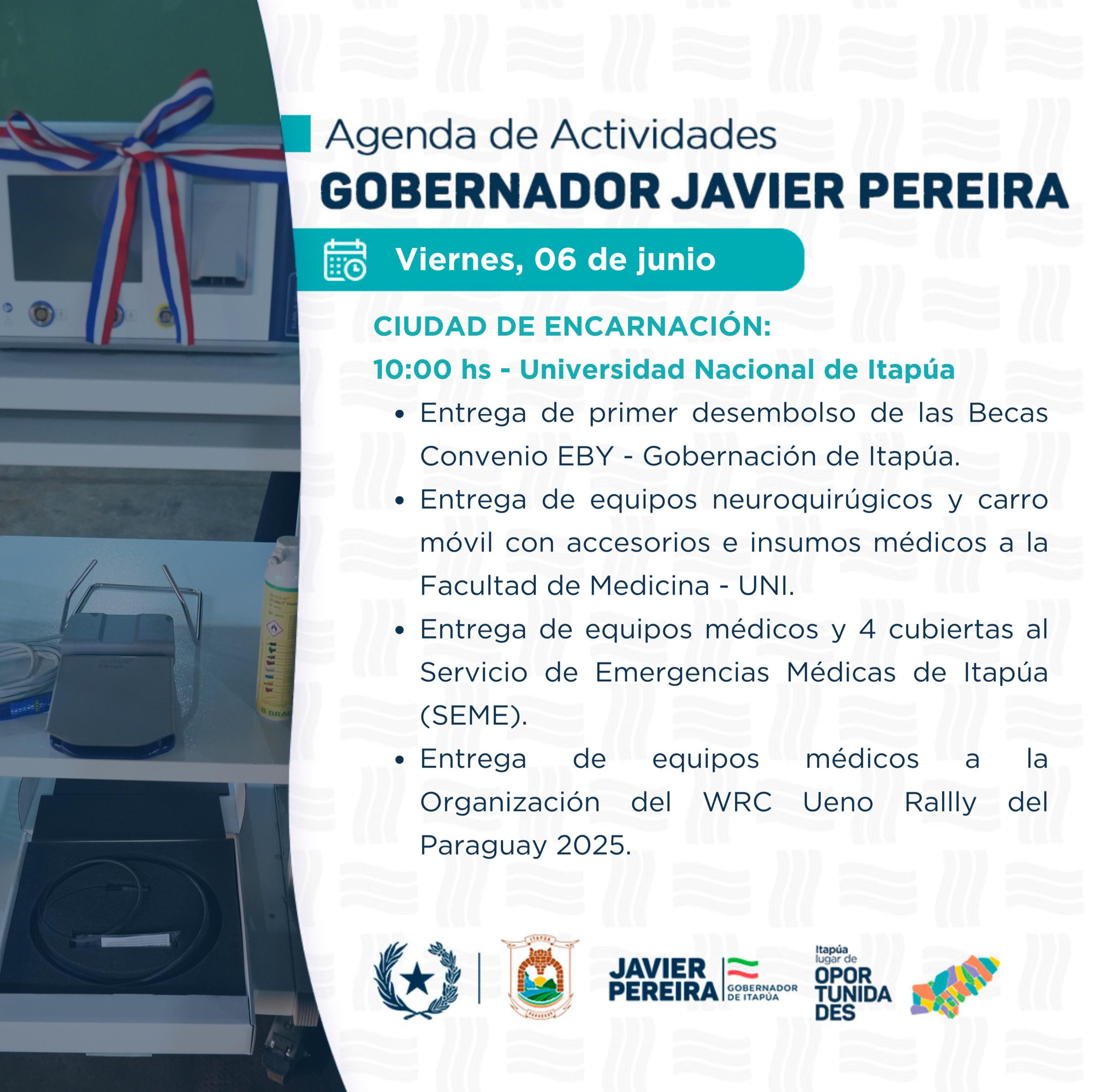 El Gobernador Javier Pereira desarrollará una jornada de trabajo este viernes 6 de junio en la Universidad Nacional de Itapúa, acompañado del Señor Presidente de la República.
