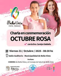 Invitamos a las mujeres de Bella Vista a participar de esta importante charla de concientización, en el marco de Octubre Rosa, mes dedicado a la prevención del cáncer de mama y otros tipos de cáncer. Porque la información salva vidas, te esperamos para compartir un espacio de aprendizaje, reflexión y acción por nuestra salud.