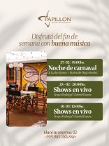 En el Hotel Papillón los Carnavales continua, no faltes. 27/02/2026 con Lucho Ramos a partir de las 19:oo horas 28/02/2026 con el Grupo Madrigal desde las 20:00 horas 01/03/2028 nuevamente con el Grupo Madrigal a partir de las 12:00 horas