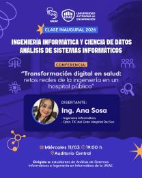 el marco del inicio del año académico, estudiantes de la Lic. en Análisis de Sistemas Informáticos e Ingeniería Informática y Ciencia de Datos de la UNAE participarán de la Clase inaugural “Transformación digital en salud: Retos reales de la Ingeniería en un hospital público”, a cargo de la Ing. Ana Sosa. Miércoles 11 de marzo Horas: […] |