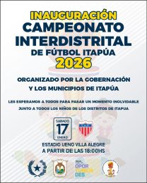 ⚽🎉 INAUGURACIÓN DEL CAMPEONATO INTERDISTRITAL DE FÚTBOL ITAPÚA 2026 🎉 La Gobernación de Itapúa, junto a los Municipios del departamento, tiene el honor de invitar a toda la ciudadanía a la gran inauguración del Campeonato Interdistrital de Fútbol Itapúa 2026. Vivamos juntos una jornada llena de deporte, alegría y emoción, acompañando a los niños y […]