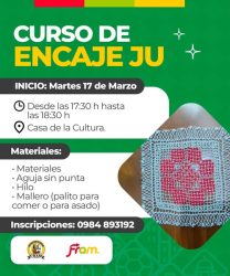 La Municipalidad de Fram te invita al Curso de Encaje Ju Inicio: Martes 17 de marzo Horario: 17:30 a 18:30 horas Lugar: Casa de la Cultura Materiales a llevar: • Aguja sin punta • Hilo • Mallero (palito para comer o para asado) Inscripciones: 0984 893192