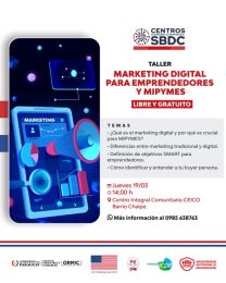 Participá de la Capacitación gratuita para MIPYMES! “Marketing digital para emprendedores y MIPYMES" Jueves 19 de marzo 2026 14:00 horas Centro Integral Comunitario CEICO - Barrio Chaipe. Preinscripción: https://forms.unae.edu.py/sbdc/odaegy Para más información, comunicarse al (0985)638763 Ministerio de Industria y Comercio de Paraguay. |